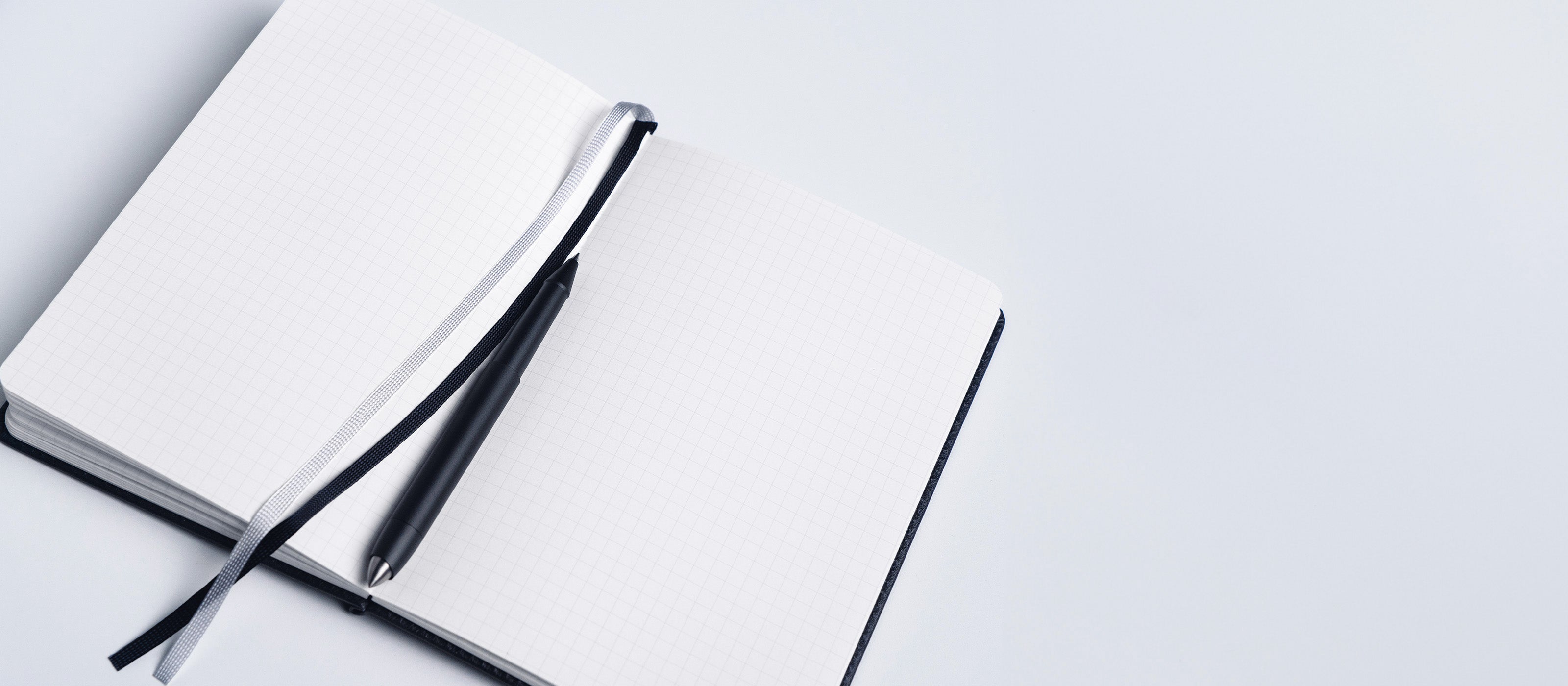 A5サイズのNoviumハードカバーノートブック。ライトグレーのグリッドが描かれたページは、自由にアイデアを書き留めるためのキャンバス。