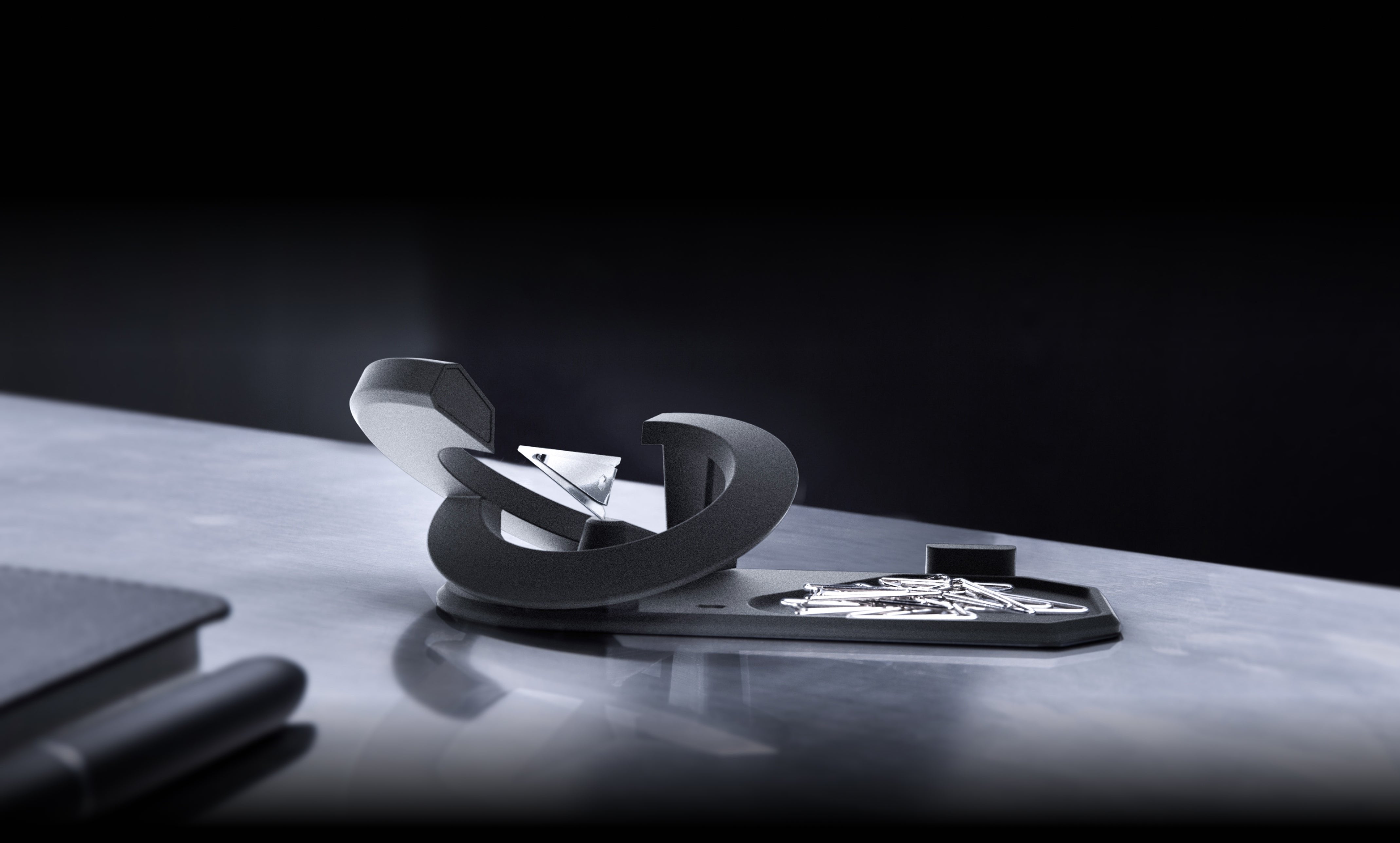 銀河に座す発射台を模したペーパークリップホルダー。クリップの発射ごとに新たなミッションがマークされる。